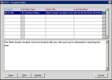 Int. An X appears in this column if the lead note is internal. This is the default. A lead note is designated as "internal" on the Lead Notes Add screen or the Lead Notes - Edit screen. The "internal' designation means that the note will not be included as part of any document or report prepared for the client.