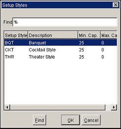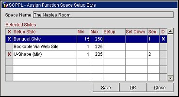 Multi-select list of setup styles to assign to the function space. Only Web Bookable setup styles are displayed and can be selected for a Web Bookable package.