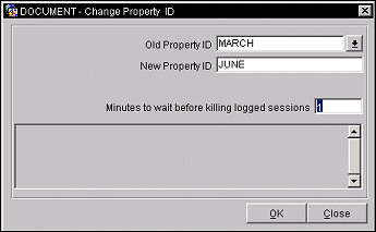 The Change Property ID (Utilities>Property Config>Change Property ID) is primarily a Corporate Shell function and is the second step you perform after importing the Corporate Shell. You can run this utility tool and change the property ID to the actual property ID required by your property. When changing the property ID, no users, no transactions, or reservations should be in process, and all users and properties associated with the schema should be logged out of the system. If users are still active in the application, running this utility will automatically kill their sessions. Processors should be stopped prior to the running of this utility.