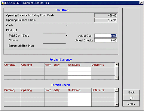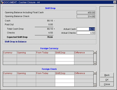 Shift Drop. Enter the amount of checks in this currency you are dropping to the General Cashier. Enter the amount in the foreign currency, not the amount converted into your local currency. For example, if you have a check for 20,000 Japanese yen, enter 20000 and not the equivalent amount in your local currency. This is the expected shift drop.