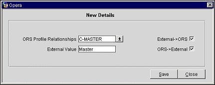 Search…in ORS/External System. Allows you to search for a specific conversion value. Depending on the OPERA/external system option button setting, the search entry will display conversion code values from the respective column in the table.