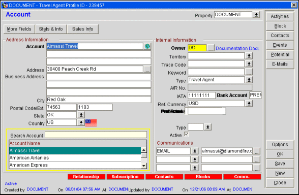 This profile is used for businesses with which the property has commercial dealings. This category might include businesses who sponsor guests, businesses for which your property handles events, or companies who directly provide products or services to your property or chain. Sources (of business) and travel agents are special kinds of businesses that have their own profile types, although in all essential respects source and travel agent profiles are identical to the company profile type. For this reason, you will see the title "Account" on the profile screen of a profile belonging to a company, an agent, or a source.