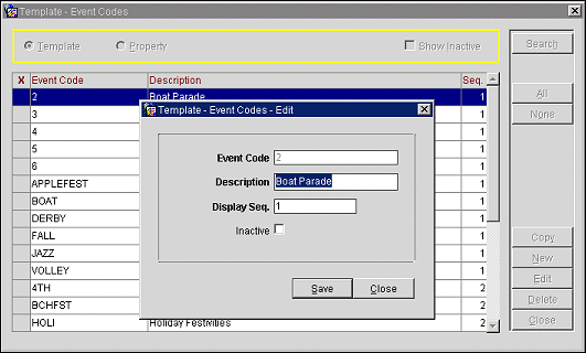 Use Event Codes setup to define event codes for events that may affect property rates and occupancy (e.g., conventions, festivals, entertainment galas, sporting events). OPERA allows special events to be entered and then displayed in the Rate Query screen and the Property Calendar screen. These could be holidays, high occupancy days, groups and conventions, etc.