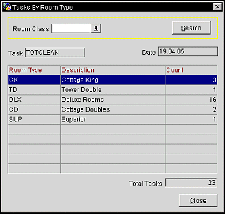 Facility Management Codes/Tasks. All requested facility management codes display for each forecasted day with the task’s required quantities as determined through the Facility Scheduler. The >> indicates that you can double-click on a date in that row to drill down to the Tasks By Room Type screen showing the number of each room type that needs to have the selected task completed for that date.