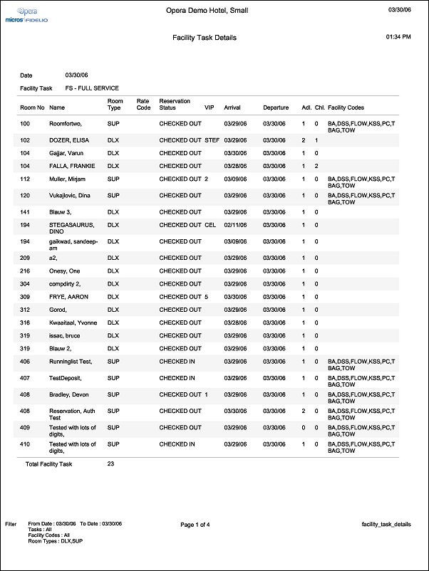 The Facility Task Details report displays all reservations, checked in and checked out, that have facility tasks assigned. When printing the full report, it is broken down by Facility Task and also displays a Facility Task Summary at the end.