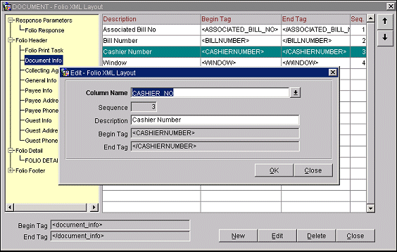 Select columns from the Response group in the tree view in order to add and edit elements in the response XML file. Select columns from the Folio Header, Folio Detail, and Folio Footer groups in the tree view in order to add and edit elements to the folio XML file. When you select a group, the enclosing XML tags for the elements in that group are shown for reference in the Begin Tag and End Tag fields in the lower part of the screen.