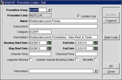 This procedure shows you how to generate unique coupon codes that are linked to a promotion code and export these coupons as a batch export file. When coupon codes are generated for a promotion, they can be distributed to select guests as part of a loyalty or rewards program. The selected guests can then use these coupons when making a reservation through the Web or directly with central reservations or the hotel. When a guest calls to make a reservation, this unique coupon code can be given the agent who can enter the code in the Coupon field of the ORS Sales Screen-Define Search, Reservation, or F5 Rate Query screens. After entering the coupon code, the promotion code will be populated in the Promotions field.