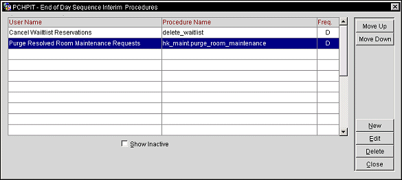 Available when the End of Day > Income Audit application function is set to Y, displays all interim procedures that can be included in the interim procedures for the income auditor to use are displayed in the End of Day Sequence Interim Procedures screen.