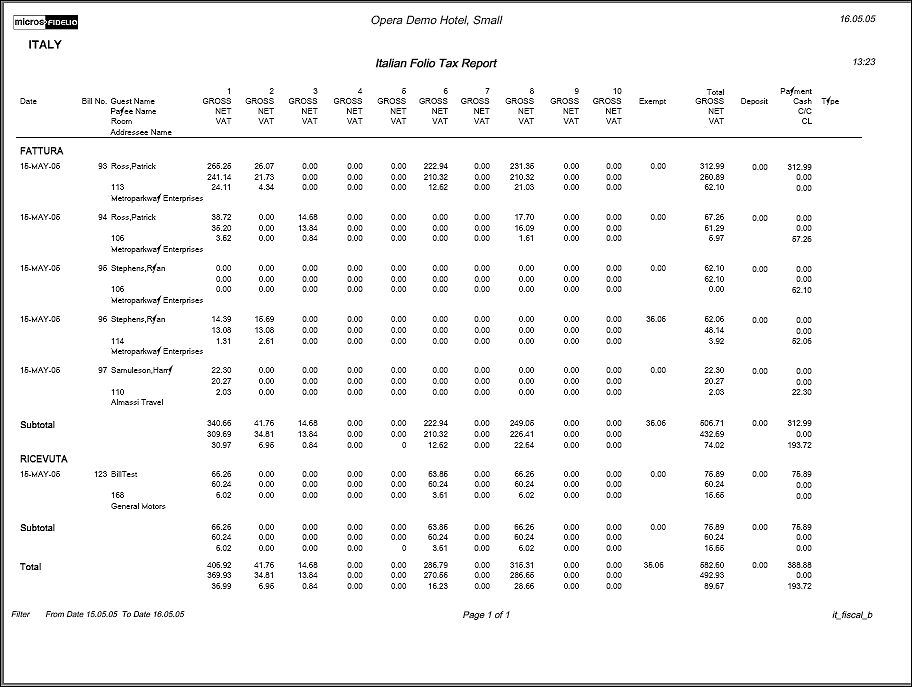 The Italian Folio Tax reports will print statistical information for all bills and is formatted based on the style of the report selected. The report output is grouped by folio types and displays the Net, VAT and Gross revenue for all bills generated in the property. The Countries parameter must be set to IT, for the reports to generate the correct data. As this is a country specific report, it must be manually added to the Report Menu. Only one of the reports has to be actually added to print either report style.