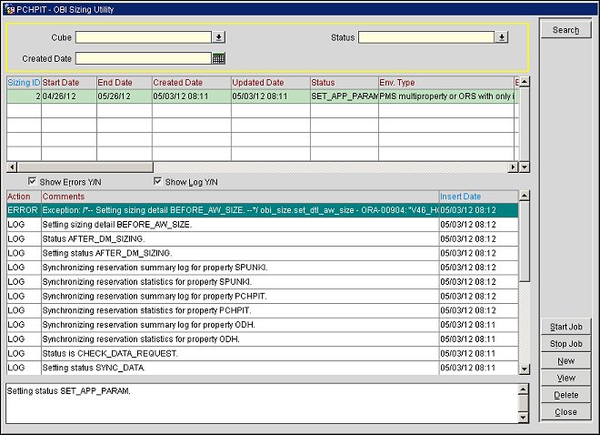 Status. Select the down arrow to choose the status (Started, Success, Failed, Completed) of the OBI Sizing Utility job to search for.
