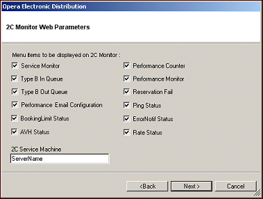 Select the menu items you want displayed on the 2C Monitor. Your options are: Service Monitor - Shows the status of the services that make up the GWIZ application. Type B In Queue - Indicates whether or not the Type B messages have been picked-up by OPERA. Type B Out Queue - Indicates whether or not messages are being sent out by OPERA. Performance Email Configuration - Allows a user to configure e-mail addresses to alert them of specific scenarios. BookingLimit Status - Displays the booking limit status information. AVH Status - Creates and sends restriction messages for the four GDS hosts. This allows for business continuity in case connectivity is lost between the GDS host and the OPERA database. Performance Counter - Measures performance. Performance Monitor - Monitors the process time. Reservation Fail - Lists all bookings that were not processed via Type B (Type B rejects). Ping Status - Displays the Ping Status information. ErrorNotif Status - Used to monitor messages for the ADS interface. It allows a user to search for messages with a status of "error" or "warning" and investigate what the issue is. Rate Status - The ACK and NACK responses received from the ADS partner are logged for rate update messages. |