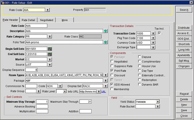 On the Rate Setup screen, the Rate Header tab allows you define the basic rate code information (the sell dates, default availability restrictions, special market or source code defaults, available room types, long information, etc.). Each rate code can have various rate details. Rate details can be specific for certain room types and rate seasons. In the rate details, the actual rate amounts are determined according to single/multiple occupancy, standard specific days of the week rates, and specials, such as package additions, etc. Complete the rate header information for the new rate code. Once completed and saved, select the Rate Detail tab to continue configuring your rate code.