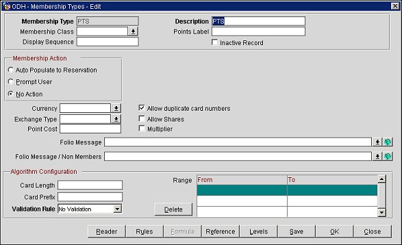 Membership types are used to identify the kinds of membership programs that are accepted by PMS and ORS/OCIS. The membership type information entered here includes the membership type code, membership program levels, or tiers (for example, gold, silver, bronze, elite, executive, and so on); the program rules (methods of points calculation, card validation algorithms, etc.); and the specific awards (special rates, upgrades, products, etc.) associated with each membership card type.