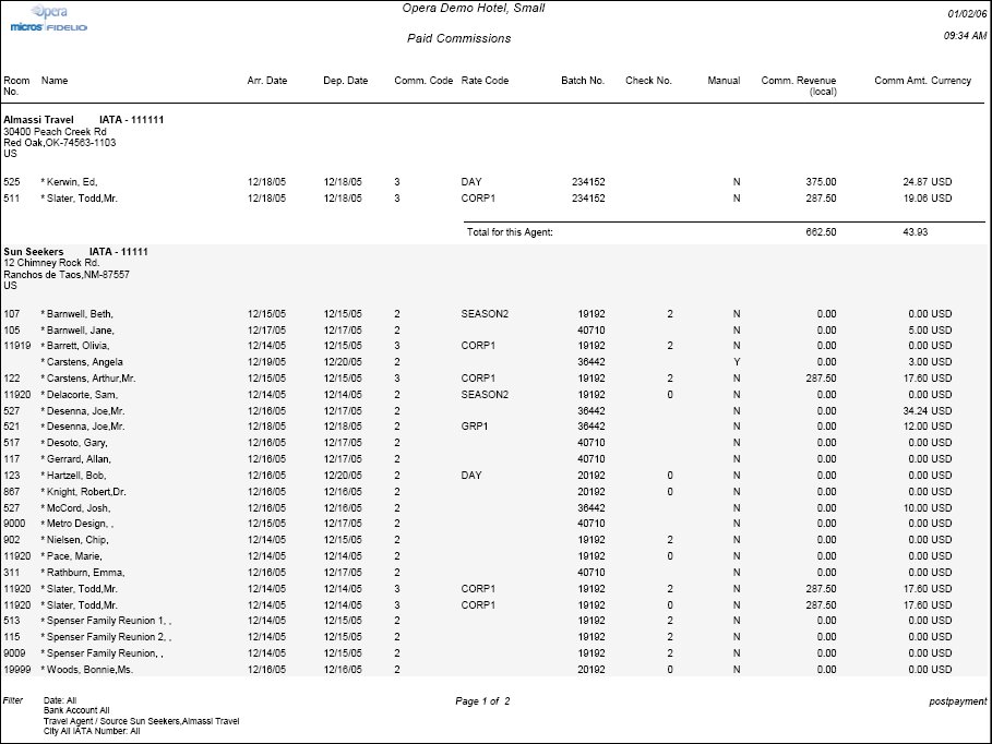 The Paid Commission report will provide the same information displayed in the Commission Register screen. This includes all Reservations and corresponding Travel Agents/Source Profiles that have been processed. The filter criteria on the COM4.FMX allow the report output to be fine tuned to only display very specific records.