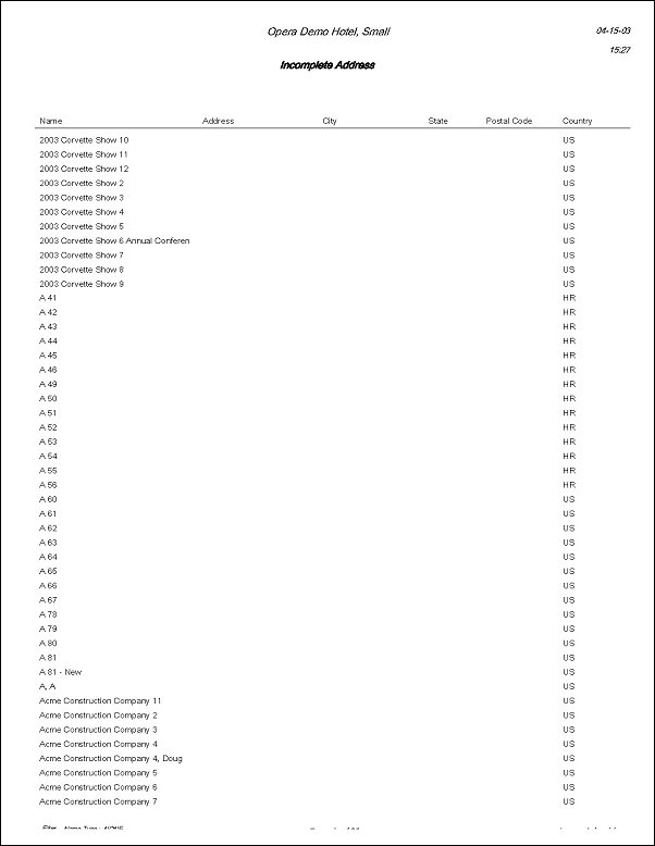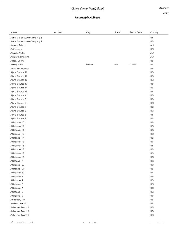 The Guests Incomplete Addresses Report displays all Profiles that have incomplete address information. A complete address is defined as populating at least one Address line, City, State, Postal Code and Country Code fields on the Profile. Use this report to track all incomplete Profile records in your system so you can either correct the address information, or purge the Profile from the system.