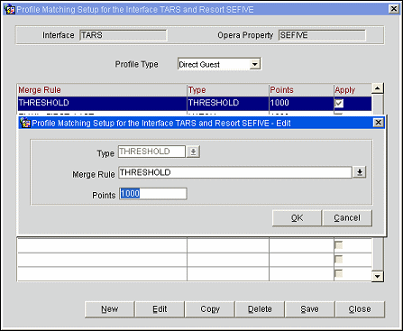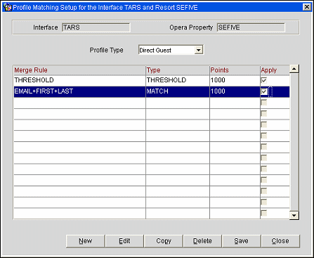 Copy. This option copies a standard set of merge rules from the default system data. This can be used as a starting point for a new interface, as all possible merge rules are created with one data field at a time and without point values. Make sure that you update the point values for the threshold and the merge rules that will be used.
