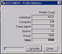 The Profile Statistics utility may be used to review the number of active profiles in the OPERA database. To access the utility, select Utilities>Profile>Statistics. The Profile Statistics screen appears.