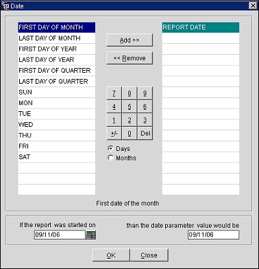 IF THE REPORT WAS STARTED ON and THEN THE DATE PARAMETER VALUE WOULD BE fields. The Date screen reads the current date on the database server and displays two dates in the "If the report was started on" field and the "then the date parameter value would be" field. As the user makes changes, the "If the report was started on" field and the "then the date parameter value would be" field changes dates. When the next, subsequent month arrives the system will read the dates and apply the same values to that month, adjusting the dates automatically.