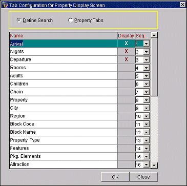 At the Tab Configuration for Property Display Screen, select the Define Search option button to view the options for defining a search on the Sell screen>Define Search screen. There are 37 labels from which the user can select, but the 37th label will not be available for display on the Define Search screen because of space limitations on the screen. However, if a user wants the 37th label to be displayed on the Define Search screen, the user can change the display sequence of the label to a lower sequence. For example, change Seq. for label from 37 to 20 and then select the label for display. The existing names and sequence show the Sell screen’s current configuration.