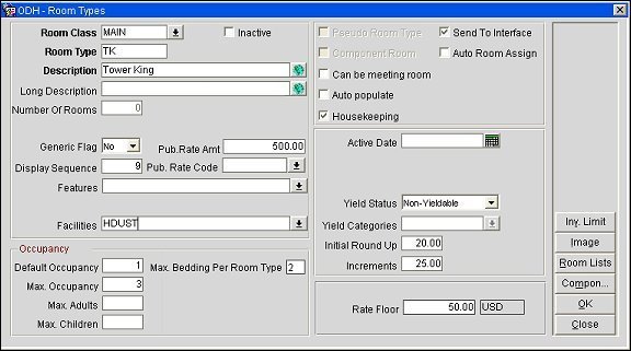 Inactive. This check box may be selected only if there is no inventory available for this room type at the property, for example. The same validation checks for deleting a room type remain in effect for inactivating a room type. These include the following: the room type cannot be associated with a rate code; it cannot be associated with a current and/or future reservation; it cannot be associated with an active business block; it cannot have room numbers associated with it; and it cannot be part of a component room type configuration. (Inactive room types will not display as an option when you select the Room Type LOV on the Reservation screen, when viewing the Rate Query Details screen, or when accessing the Room Grid from within the Business Blocks module.)