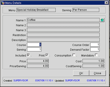 To begin editing a menu item that is attached to a composed menu, highlight the item from the Composed Menu Details grid on the Standard Menu Setup screen and select the Edit button (The Standard Menu Setup screen is available by selecting Configuration>Catering>Standard Menu Setup.) The Menu Details screen appears.