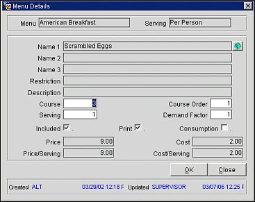 Consumption. Select this check box if this menu item is based on consumption. Selecting this option enables the entry of a quantity used for forecasting. Included is not available if this option is selected. On the BEO, an item marked as Consumption will print price and container — not quantity.