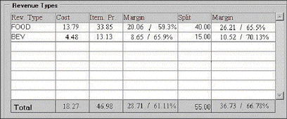 The information won't be accurate to define the split if we sum up all the costs and item prices. Therefore, an average must be calculated per category (because we can have different numbers of menu items per category), and then sum of the category average per Revenue Type: