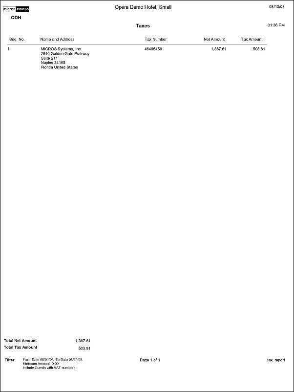 Include Guests with no VAT Number. When checked, the report displays all guest accounts. Only Company, Travel Agent, Source and Group Profiles can have a VAT number assigned.