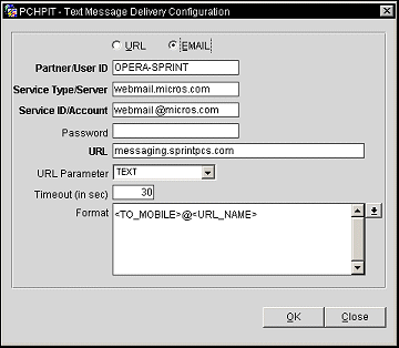 When the General>Text Message Handling application function is set to Y, select the Delivery button to open the Text Message Delivery Configuration screen and configure the delivery method for the Text message. For delivery configuration details, contact your Text Delivery Provider or refer to the provider’s user documentation. For this feature to work, ensure the information is entered correctly. Also, check with the local Oracle office to ensure that your version of OPERA can connect to the Text Message provider that your property will be using.
