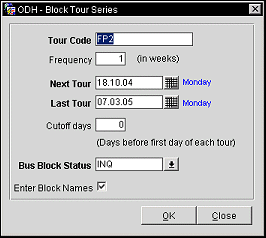 Note: When the Block>Tour Series Handling is set to M, changes that are made to a tour series will affect both the master and sub-bookings for the entire tour. If the setting is set to S, then a simple copy is made of the original tour series booking. Changes that are made to either the original booking or one of the copies will only affect that particular booking.