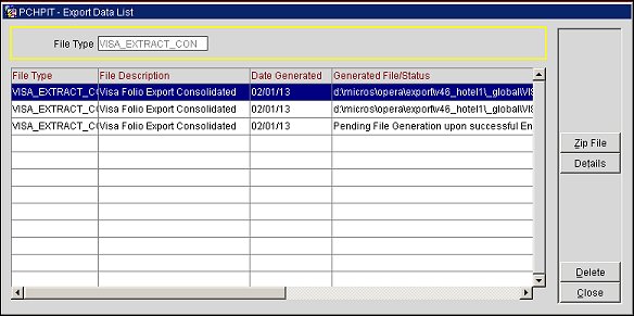 The VISA_EXTRACT_CON Export is used to generate the VISA Consolidated Extract automatically during the End of Day (Night Audit) procedure.