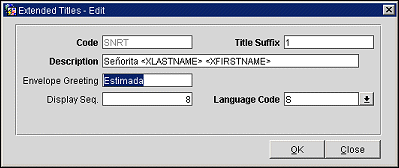 Note: When Global > Profiles > Parameters > Advanced Title = Y, the Title Suffix functionality will be available, and the “Title Suffix” field will be displayed on the Titles-New/Edit screen. With Title Suffix, by assigning a different suffix number, a user can configure many different salutations and envelope greetings for the same Title Code. When Global > Profiles > Parameters > Advanced Title = N, the “Title Suffix” field will not display and the Advanced Title functionality is not available. However, with the Advanced Title application parameter set to N, a user can still create different titles using the same title code. The difference is that with Advanced Title parameter set to Y, a Title Suffix is required when creating titles with the same title code. See the tables under Advanced Title section for examples on how this works.